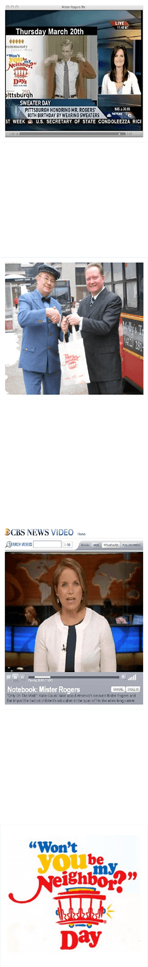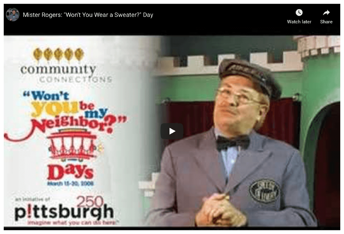Because the show was filmed in Pittsburgh, we believed the local and regional media would be predisposed to feeling neighborly about the WYBMND celebration. However, we wanted to reach out to rest of the nation – even the world. But how could we engage people from Aspinwall to Australia, from Zimbabwe to Zelienople? Our answer involved asking everyone “Won’t You Wear A Sweater?” on March 20 (what would have been Fred Rogers’ 80th birthday).