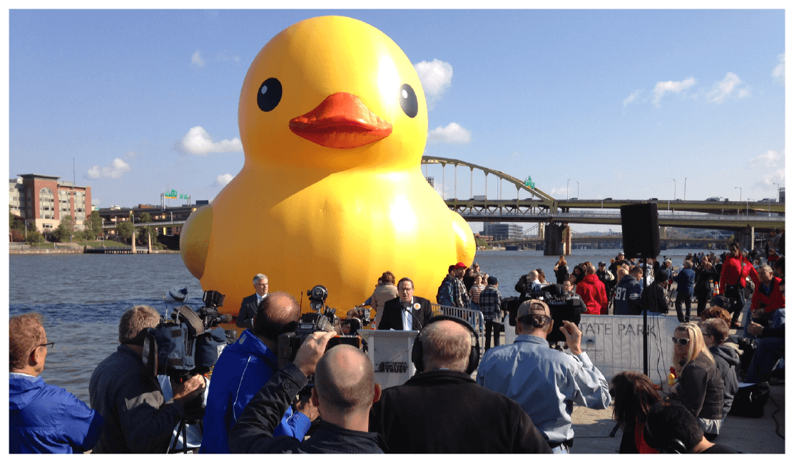 Setting Studio Florentijn Hoffman’s The Rubber Duck Project up for success began before the duck was first inflated in Pittsburgh. With our expertise in media relations, we suggested and assisted the Pittsburgh Cultural Trust’s PR Director Shaunda Miles in arranging a teaser press conference on Wednesday, Sept. 25, 2013, to announce the arrival of the duck. The event, which included the Dutch artist himself, prompted massive media coverage. We reached out to all of our media contacts–the list is almost as giant as the duck.