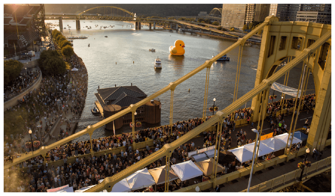 The 40-foot duck came floating into town on Friday, Sept. 27, 2013, with flocks of media keeping a “Duck Watch,” as the giant bath toy approached the Roberto Clemente Bridge for its Welcome Bridge Party. Helicopters flew overhead from each major network affiliate to document the moment with 100,000+ people lining the river to catch a glimpse of the action.