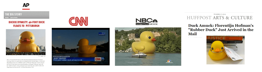 From local to national coverage, the Studio Florentijn Hoffman’s The Rubber Duck Project became a Pittsburgh phenomenon. It appeared on Good Morning America, NBC Nightly News, CNN, Aljazeera America, and Today in addition to numerous local reports from KDKA, WTAE, and WPXI. Studio Florentijn Hoffman’s The Rubber Duck Project U.S. premiere in Pittsburgh also went viral on a variety of websites, including the Associated Press, Yahoo!, BuzzFeed, Wired, Huffington Post, and Newsday.